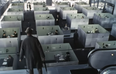 playtime1Playtime is a film that really can be broken into a number of set pieces elaborately constructed by director Jacques Tati. The vignettes begin, surprisingly enough, in an airport terminal, and a group of excited Americans are getting ready for a Parisian vacation. Mr. Hulot (Tati himself) is waiting to have a meeting in a glass office building, however, he soon gets lost in a maze of cubicles, playing cat and mouse with his contact.