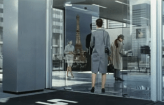 Quite by accident, he wanders into an international trade exhibition and the tourists just happen to be there too. While there they are introduced to the latest gizmos, gadgets, and inventions to move society forward. They include silently slamming doors and retractable glasses. In typical Tati fashion, he gives us a glimpse of the old world from Mon Oncle. All that is left is one meager flower stand and a brief reflection of the Eiffel Tower.