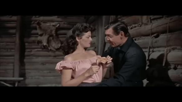 Gable and Russell end up in a cabin together out of the cold. It’s not quite the “Walls of Jericho,” but as Gable cooks up some meat over the fire, and she warms her feet on his back with a few playful kicks, the moment becomes the highlight of the picture thus far. We understand and appreciate the human connection unfolding before us going beyond dialogue or plot points even the nature outside. It’s about two people connecting with one another in a movie but also as individual performers.