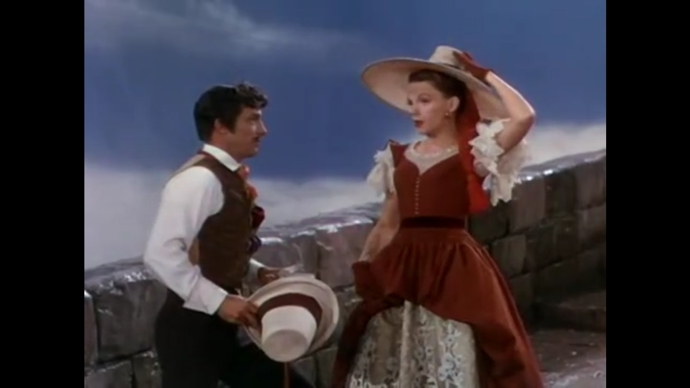 Kelly, taking all the niñas of the town by storm, is full of allure and his usual magnetism as he twirls, leaps, and bounds between all the pretty girls. It’s all about the patter between the stars as he plays the foxy street performer, and Garland is the put-upon maiden who is betrothed to another man. His vocation gives the director license to use these elements of theatricality and faux drama to tell the story.