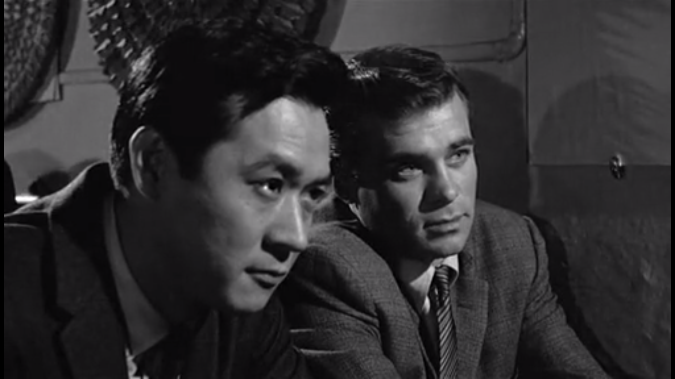 The Crimson Kimono is an extraordinary film historically because it depicts something that we very rarely see, especially for 1959. The late, great actor James Shigeta portrayed the straight-laced policeman and former Korean War hero named Joe Kojaku. He’s a sympathetic figure and hardly a caricature. His best friend is the Caucasian Charlie Bancroft (Glenn Corbett), who is on the LAPD with Joe and a war buddy. They are inseparable and they share a flat. Above all, the most amazing thing is that Joe gets the girl over his friend! That might be a small victory, but I have seen a lot of films to know that the Asian guy never gets the girl, especially if she is Caucasian. Sam Fuller subverts the norm and it is a major statement on interracial romance in an age when many would have scoffed at it. However, Fuller also takes immense care to look at both sides of the equation, and he allows both men the benefit of the doubt. Joe must figure out his own identity even acknowledging, “I was born here. I’m American but what am I? Japanese, Japanese American, Nisei? What label do I live under?” The question is not an easy one and it is one that he struggles with over the course of the entire film, navigating his feelings towards Charlie and then the beautiful artist Chris (Victoria Shaw).