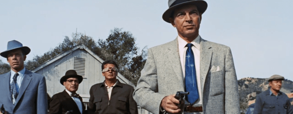 It’s a visual cue that feels rather reminiscent of Bad Day at Black Rock, and in some general sense, the comparison is not too far off base. For one, we have the return of both Marvin and Ernest Borgnine. The former is a sickly thug in gray, who doesn’t go anywhere without his inhaler, while still burning with that typical sadism. Borgnine, for his part, has a rather twee role as the patriarch of an Amish family. It’s true the crucial element of the plot revolves around these three criminals convening in the hotel to case the local bank and lay out their plans to break in.